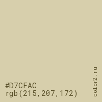 Цвет #D7CFAC в цветовой модели RGB обозначается тремя октетами (215, 207, 172) в десятичном формате и #D7CFAC в шестнадцатиричном (hex) формате, которые являются интенсивностью красного 215 (hex D7), интенсивность зелёного 207 (hex CF) и интенсивность синего 172 (hex AC).