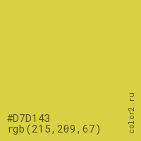Цвет #D7D143 в цветовой модели RGB обозначается тремя октетами (215, 209, 67) в десятичном формате и #D7D143 в шестнадцатиричном (hex) формате, которые являются интенсивностью красного 215 (hex D7), интенсивность зелёного 209 (hex D1) и интенсивность синего 67 (hex 43).