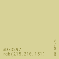 Цвет #D7D297 в цветовой модели RGB обозначается тремя октетами (215, 210, 151) в десятичном формате и #D7D297 в шестнадцатиричном (hex) формате, которые являются интенсивностью красного 215 (hex D7), интенсивность зелёного 210 (hex D2) и интенсивность синего 151 (hex 97).