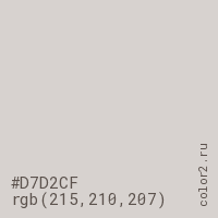 Цвет #D7D2CF в цветовой модели RGB обозначается тремя октетами (215, 210, 207) в десятичном формате и #D7D2CF в шестнадцатиричном (hex) формате, которые являются интенсивностью красного 215 (hex D7), интенсивность зелёного 210 (hex D2) и интенсивность синего 207 (hex CF).