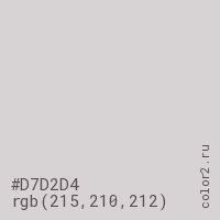 Цвет #D7D2D4 в цветовой модели RGB обозначается тремя октетами (215, 210, 212) в десятичном формате и #D7D2D4 в шестнадцатиричном (hex) формате, которые являются интенсивностью красного 215 (hex D7), интенсивность зелёного 210 (hex D2) и интенсивность синего 212 (hex D4).