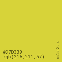 Цвет #D7D339 в цветовой модели RGB обозначается тремя октетами (215, 211, 57) в десятичном формате и #D7D339 в шестнадцатиричном (hex) формате, которые являются интенсивностью красного 215 (hex D7), интенсивность зелёного 211 (hex D3) и интенсивность синего 57 (hex 39).