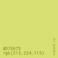 Цвет #D7E073 в цветовой модели RGB обозначается тремя октетами (215, 224, 115) в десятичном формате и #D7E073 в шестнадцатиричном (hex) формате, которые являются интенсивностью красного 215 (hex D7), интенсивность зелёного 224 (hex E0) и интенсивность синего 115 (hex 73).
