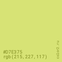 Цвет #D7E375 в цветовой модели RGB обозначается тремя октетами (215, 227, 117) в десятичном формате и #D7E375 в шестнадцатиричном (hex) формате, которые являются интенсивностью красного 215 (hex D7), интенсивность зелёного 227 (hex E3) и интенсивность синего 117 (hex 75).