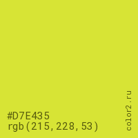 Цвет #D7E435 в цветовой модели RGB обозначается тремя октетами (215, 228, 53) в десятичном формате и #D7E435 в шестнадцатиричном (hex) формате, которые являются интенсивностью красного 215 (hex D7), интенсивность зелёного 228 (hex E4) и интенсивность синего 53 (hex 35).