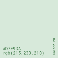 Цвет RGB(215, 233, 218) в процентом отношении количества цвета состоит из 84.3% красного (red), 91.4% зелёного (green) и 85.5% синего (blue).