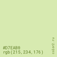 Цвет #D7EAB0 в цветовой модели RGB обозначается тремя октетами (215, 234, 176) в десятичном формате и #D7EAB0 в шестнадцатиричном (hex) формате, которые являются интенсивностью красного 215 (hex D7), интенсивность зелёного 234 (hex EA) и интенсивность синего 176 (hex B0).
