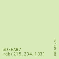 Цвет #D7EAB7 в цветовой модели RGB обозначается тремя октетами (215, 234, 183) в десятичном формате и #D7EAB7 в шестнадцатиричном (hex) формате, которые являются интенсивностью красного 215 (hex D7), интенсивность зелёного 234 (hex EA) и интенсивность синего 183 (hex B7).