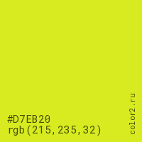 Цвет #D7EB20 в цветовой модели RGB обозначается тремя октетами (215, 235, 32) в десятичном формате и #D7EB20 в шестнадцатиричном (hex) формате, которые являются интенсивностью красного 215 (hex D7), интенсивность зелёного 235 (hex EB) и интенсивность синего 32 (hex 20).