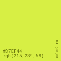 Цвет #D7EF44 в цветовой модели RGB обозначается тремя октетами (215, 239, 68) в десятичном формате и #D7EF44 в шестнадцатиричном (hex) формате, которые являются интенсивностью красного 215 (hex D7), интенсивность зелёного 239 (hex EF) и интенсивность синего 68 (hex 44).