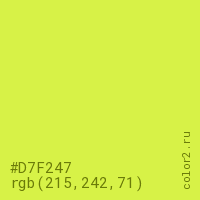 Цвет #D7F247 в цветовой модели RGB обозначается тремя октетами (215, 242, 71) в десятичном формате и #D7F247 в шестнадцатиричном (hex) формате, которые являются интенсивностью красного 215 (hex D7), интенсивность зелёного 242 (hex F2) и интенсивность синего 71 (hex 47).