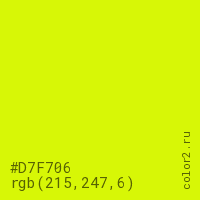 Цвет #D7F706 в цветовой модели RGB обозначается тремя октетами (215, 247, 6) в десятичном формате и #D7F706 в шестнадцатиричном (hex) формате, которые являются интенсивностью красного 215 (hex D7), интенсивность зелёного 247 (hex F7) и интенсивность синего 6 (hex 06).