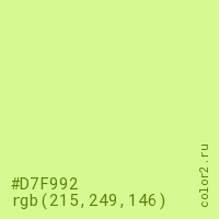 Цвет #D7F992 в цветовой модели RGB обозначается тремя октетами (215, 249, 146) в десятичном формате и #D7F992 в шестнадцатиричном (hex) формате, которые являются интенсивностью красного 215 (hex D7), интенсивность зелёного 249 (hex F9) и интенсивность синего 146 (hex 92).