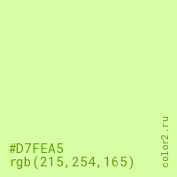 Цвет #D7FEA5 в цветовой модели RGB обозначается тремя октетами (215, 254, 165) в десятичном формате и #D7FEA5 в шестнадцатиричном (hex) формате, которые являются интенсивностью красного 215 (hex D7), интенсивность зелёного 254 (hex FE) и интенсивность синего 165 (hex A5).
