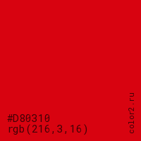 Цвет #D80310 в цветовой модели RGB обозначается тремя октетами (216, 3, 16) в десятичном формате и #D80310 в шестнадцатиричном (hex) формате, которые являются интенсивностью красного 216 (hex D8), интенсивность зелёного 3 (hex 03) и интенсивность синего 16 (hex 10).