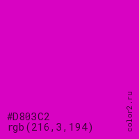 Цвет #D803C2 в цветовой модели RGB обозначается тремя октетами (216, 3, 194) в десятичном формате и #D803C2 в шестнадцатиричном (hex) формате, которые являются интенсивностью красного 216 (hex D8), интенсивность зелёного 3 (hex 03) и интенсивность синего 194 (hex C2).