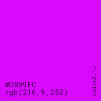 Цвет #D809FC в цветовой модели RGB обозначается тремя октетами (216, 9, 252) в десятичном формате и #D809FC в шестнадцатиричном (hex) формате, которые являются интенсивностью красного 216 (hex D8), интенсивность зелёного 9 (hex 09) и интенсивность синего 252 (hex FC).