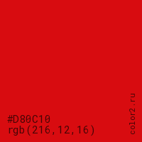 Цвет #D80C10 в цветовой модели RGB обозначается тремя октетами (216, 12, 16) в десятичном формате и #D80C10 в шестнадцатиричном (hex) формате, которые являются интенсивностью красного 216 (hex D8), интенсивность зелёного 12 (hex 0C) и интенсивность синего 16 (hex 10).
