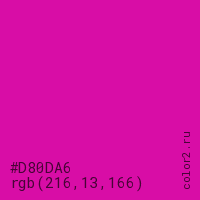 Цвет #D80DA6 в цветовой модели RGB обозначается тремя октетами (216, 13, 166) в десятичном формате и #D80DA6 в шестнадцатиричном (hex) формате, которые являются интенсивностью красного 216 (hex D8), интенсивность зелёного 13 (hex 0D) и интенсивность синего 166 (hex A6).