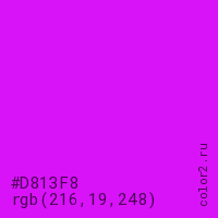 Цвет #D813F8 в цветовой модели RGB обозначается тремя октетами (216, 19, 248) в десятичном формате и #D813F8 в шестнадцатиричном (hex) формате, которые являются интенсивностью красного 216 (hex D8), интенсивность зелёного 19 (hex 13) и интенсивность синего 248 (hex F8).