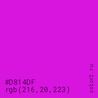 Цвет #D814DF в цветовой модели RGB обозначается тремя октетами (216, 20, 223) в десятичном формате и #D814DF в шестнадцатиричном (hex) формате, которые являются интенсивностью красного 216 (hex D8), интенсивность зелёного 20 (hex 14) и интенсивность синего 223 (hex DF).