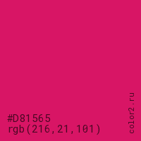 Цвет #D81565 в цветовой модели RGB обозначается тремя октетами (216, 21, 101) в десятичном формате и #D81565 в шестнадцатиричном (hex) формате, которые являются интенсивностью красного 216 (hex D8), интенсивность зелёного 21 (hex 15) и интенсивность синего 101 (hex 65).