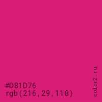 Цвет #D81D76 в цветовой модели RGB обозначается тремя октетами (216, 29, 118) в десятичном формате и #D81D76 в шестнадцатиричном (hex) формате, которые являются интенсивностью красного 216 (hex D8), интенсивность зелёного 29 (hex 1D) и интенсивность синего 118 (hex 76).