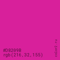 Цвет #D8209B в цветовой модели RGB обозначается тремя октетами (216, 32, 155) в десятичном формате и #D8209B в шестнадцатиричном (hex) формате, которые являются интенсивностью красного 216 (hex D8), интенсивность зелёного 32 (hex 20) и интенсивность синего 155 (hex 9B).