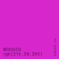 Цвет #D826CD в цветовой модели RGB обозначается тремя октетами (216, 38, 205) в десятичном формате и #D826CD в шестнадцатиричном (hex) формате, которые являются интенсивностью красного 216 (hex D8), интенсивность зелёного 38 (hex 26) и интенсивность синего 205 (hex CD).