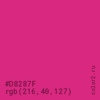 Цвет #D8287F в цветовой модели RGB обозначается тремя октетами (216, 40, 127) в десятичном формате и #D8287F в шестнадцатиричном (hex) формате, которые являются интенсивностью красного 216 (hex D8), интенсивность зелёного 40 (hex 28) и интенсивность синего 127 (hex 7F).