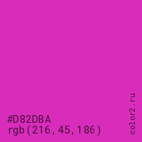 Цвет #D82DBA в цветовой модели RGB обозначается тремя октетами (216, 45, 186) в десятичном формате и #D82DBA в шестнадцатиричном (hex) формате, которые являются интенсивностью красного 216 (hex D8), интенсивность зелёного 45 (hex 2D) и интенсивность синего 186 (hex BA).