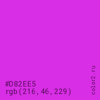 Цвет #D82EE5 в цветовой модели RGB обозначается тремя октетами (216, 46, 229) в десятичном формате и #D82EE5 в шестнадцатиричном (hex) формате, которые являются интенсивностью красного 216 (hex D8), интенсивность зелёного 46 (hex 2E) и интенсивность синего 229 (hex E5).