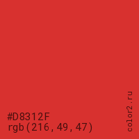 Цвет #D8312F в цветовой модели RGB обозначается тремя октетами (216, 49, 47) в десятичном формате и #D8312F в шестнадцатиричном (hex) формате, которые являются интенсивностью красного 216 (hex D8), интенсивность зелёного 49 (hex 31) и интенсивность синего 47 (hex 2F).