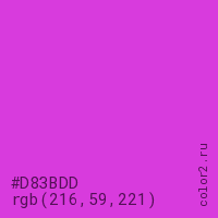Цвет #D83BDD в цветовой модели RGB обозначается тремя октетами (216, 59, 221) в десятичном формате и #D83BDD в шестнадцатиричном (hex) формате, которые являются интенсивностью красного 216 (hex D8), интенсивность зелёного 59 (hex 3B) и интенсивность синего 221 (hex DD).