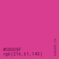Цвет #D83D8F в цветовой модели RGB обозначается тремя октетами (216, 61, 143) в десятичном формате и #D83D8F в шестнадцатиричном (hex) формате, которые являются интенсивностью красного 216 (hex D8), интенсивность зелёного 61 (hex 3D) и интенсивность синего 143 (hex 8F).