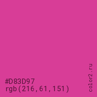 Цвет #D83D97 в цветовой модели RGB обозначается тремя октетами (216, 61, 151) в десятичном формате и #D83D97 в шестнадцатиричном (hex) формате, которые являются интенсивностью красного 216 (hex D8), интенсивность зелёного 61 (hex 3D) и интенсивность синего 151 (hex 97).