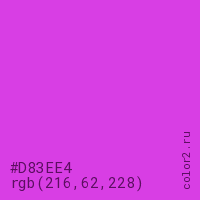 Цвет #D83EE4 в цветовой модели RGB обозначается тремя октетами (216, 62, 228) в десятичном формате и #D83EE4 в шестнадцатиричном (hex) формате, которые являются интенсивностью красного 216 (hex D8), интенсивность зелёного 62 (hex 3E) и интенсивность синего 228 (hex E4).