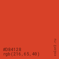 Цвет #D84128 в цветовой модели RGB обозначается тремя октетами (216, 65, 40) в десятичном формате и #D84128 в шестнадцатиричном (hex) формате, которые являются интенсивностью красного 216 (hex D8), интенсивность зелёного 65 (hex 41) и интенсивность синего 40 (hex 28).