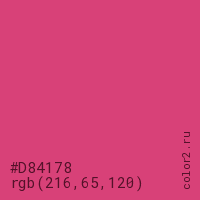 Цвет #D84178 в цветовой модели RGB обозначается тремя октетами (216, 65, 120) в десятичном формате и #D84178 в шестнадцатиричном (hex) формате, которые являются интенсивностью красного 216 (hex D8), интенсивность зелёного 65 (hex 41) и интенсивность синего 120 (hex 78).