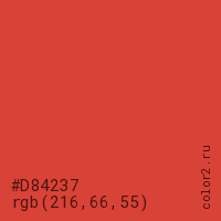 Цвет #D84237 в цветовой модели RGB обозначается тремя октетами (216, 66, 55) в десятичном формате и #D84237 в шестнадцатиричном (hex) формате, которые являются интенсивностью красного 216 (hex D8), интенсивность зелёного 66 (hex 42) и интенсивность синего 55 (hex 37).