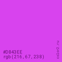 Цвет #D843EE в цветовой модели RGB обозначается тремя октетами (216, 67, 238) в десятичном формате и #D843EE в шестнадцатиричном (hex) формате, которые являются интенсивностью красного 216 (hex D8), интенсивность зелёного 67 (hex 43) и интенсивность синего 238 (hex EE).