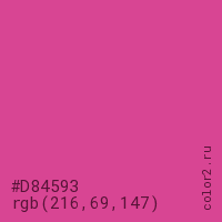 Цвет #D84593 в цветовой модели RGB обозначается тремя октетами (216, 69, 147) в десятичном формате и #D84593 в шестнадцатиричном (hex) формате, которые являются интенсивностью красного 216 (hex D8), интенсивность зелёного 69 (hex 45) и интенсивность синего 147 (hex 93).