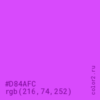 Цвет #D84AFC в цветовой модели RGB обозначается тремя октетами (216, 74, 252) в десятичном формате и #D84AFC в шестнадцатиричном (hex) формате, которые являются интенсивностью красного 216 (hex D8), интенсивность зелёного 74 (hex 4A) и интенсивность синего 252 (hex FC).