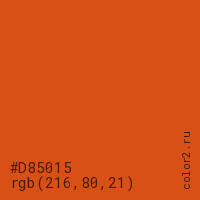 Цвет #D85015 в цветовой модели RGB обозначается тремя октетами (216, 80, 21) в десятичном формате и #D85015 в шестнадцатиричном (hex) формате, которые являются интенсивностью красного 216 (hex D8), интенсивность зелёного 80 (hex 50) и интенсивность синего 21 (hex 15).