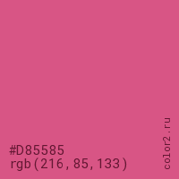 Цвет #D85585 в цветовой модели RGB обозначается тремя октетами (216, 85, 133) в десятичном формате и #D85585 в шестнадцатиричном (hex) формате, которые являются интенсивностью красного 216 (hex D8), интенсивность зелёного 85 (hex 55) и интенсивность синего 133 (hex 85).