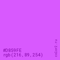 Цвет #D859FE в цветовой модели RGB обозначается тремя октетами (216, 89, 254) в десятичном формате и #D859FE в шестнадцатиричном (hex) формате, которые являются интенсивностью красного 216 (hex D8), интенсивность зелёного 89 (hex 59) и интенсивность синего 254 (hex FE).