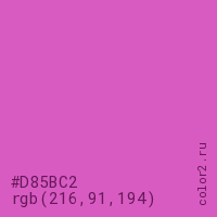 Цвет #D85BC2 в цветовой модели RGB обозначается тремя октетами (216, 91, 194) в десятичном формате и #D85BC2 в шестнадцатиричном (hex) формате, которые являются интенсивностью красного 216 (hex D8), интенсивность зелёного 91 (hex 5B) и интенсивность синего 194 (hex C2).