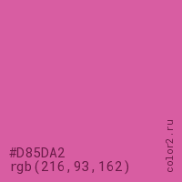 Цвет #D85DA2 в цветовой модели RGB обозначается тремя октетами (216, 93, 162) в десятичном формате и #D85DA2 в шестнадцатиричном (hex) формате, которые являются интенсивностью красного 216 (hex D8), интенсивность зелёного 93 (hex 5D) и интенсивность синего 162 (hex A2).