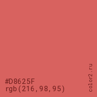 Цвет #D8625F в цветовой модели RGB обозначается тремя октетами (216, 98, 95) в десятичном формате и #D8625F в шестнадцатиричном (hex) формате, которые являются интенсивностью красного 216 (hex D8), интенсивность зелёного 98 (hex 62) и интенсивность синего 95 (hex 5F).