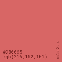 Цвет #D86665 в цветовой модели RGB обозначается тремя октетами (216, 102, 101) в десятичном формате и #D86665 в шестнадцатиричном (hex) формате, которые являются интенсивностью красного 216 (hex D8), интенсивность зелёного 102 (hex 66) и интенсивность синего 101 (hex 65).
